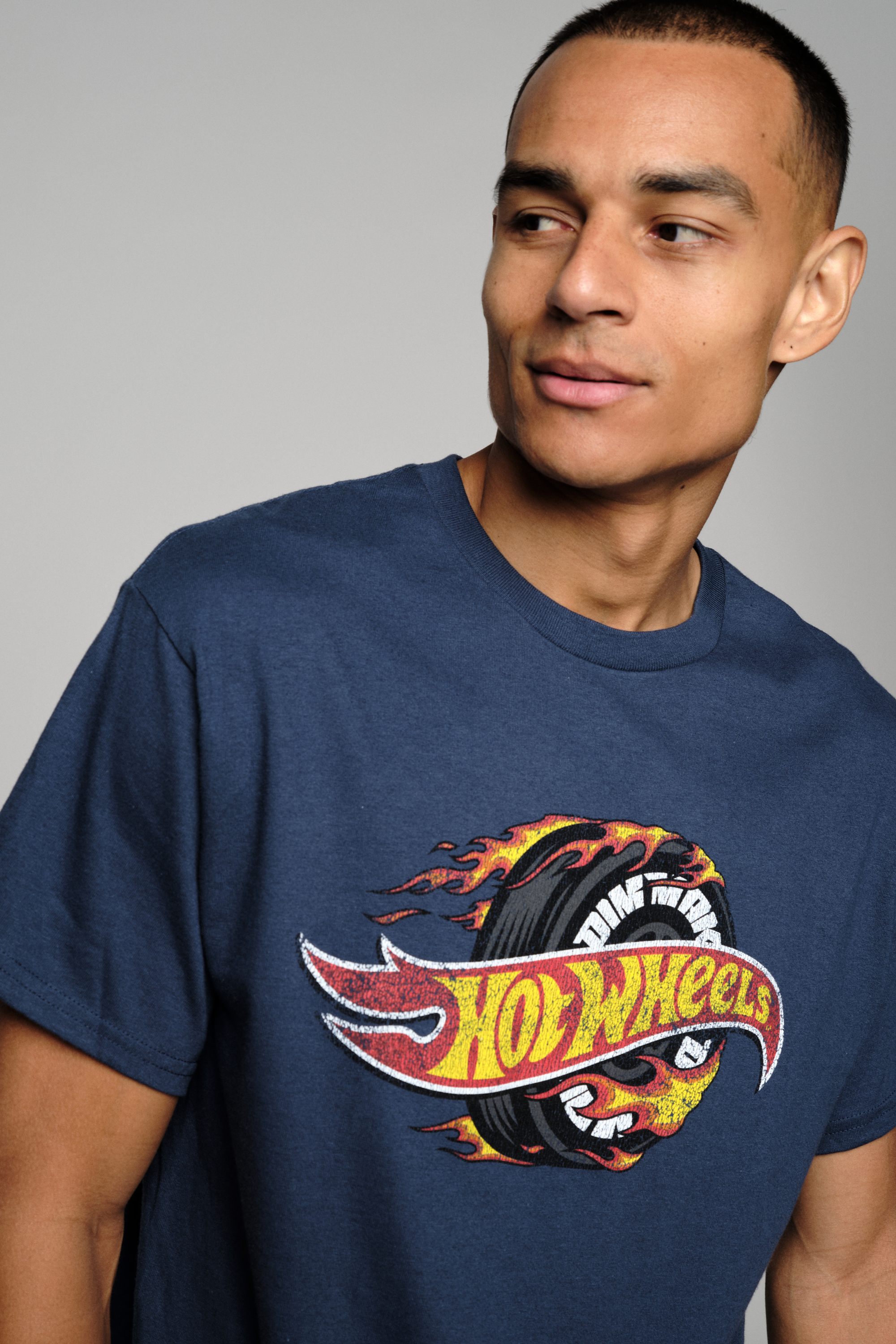 Full-throttle fashion. This Tire on Fire tee from Hot Wheels™ x DIM MAK COLLECTION® brings together two icons for one unforgettable piece. Featuring bold graphics that celebrate racing heritage and streetwear attitude.