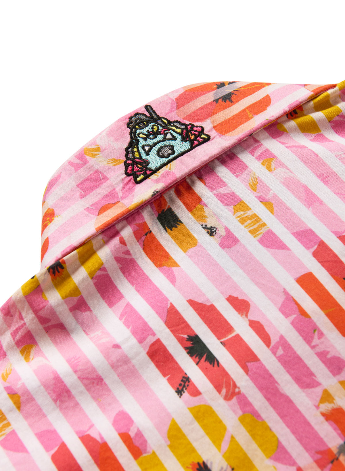 This short sleeve Oxford shirt features a 100% cotton material with a vibrant Jimbe flower print design. The chest showcases a tackle twill applique, while the center back collar is embroidered with the iconic Jimbe image. Made from premium materials and expertly crafted, this shirt is a must-have for any fan of Dim Mak or One Piece.