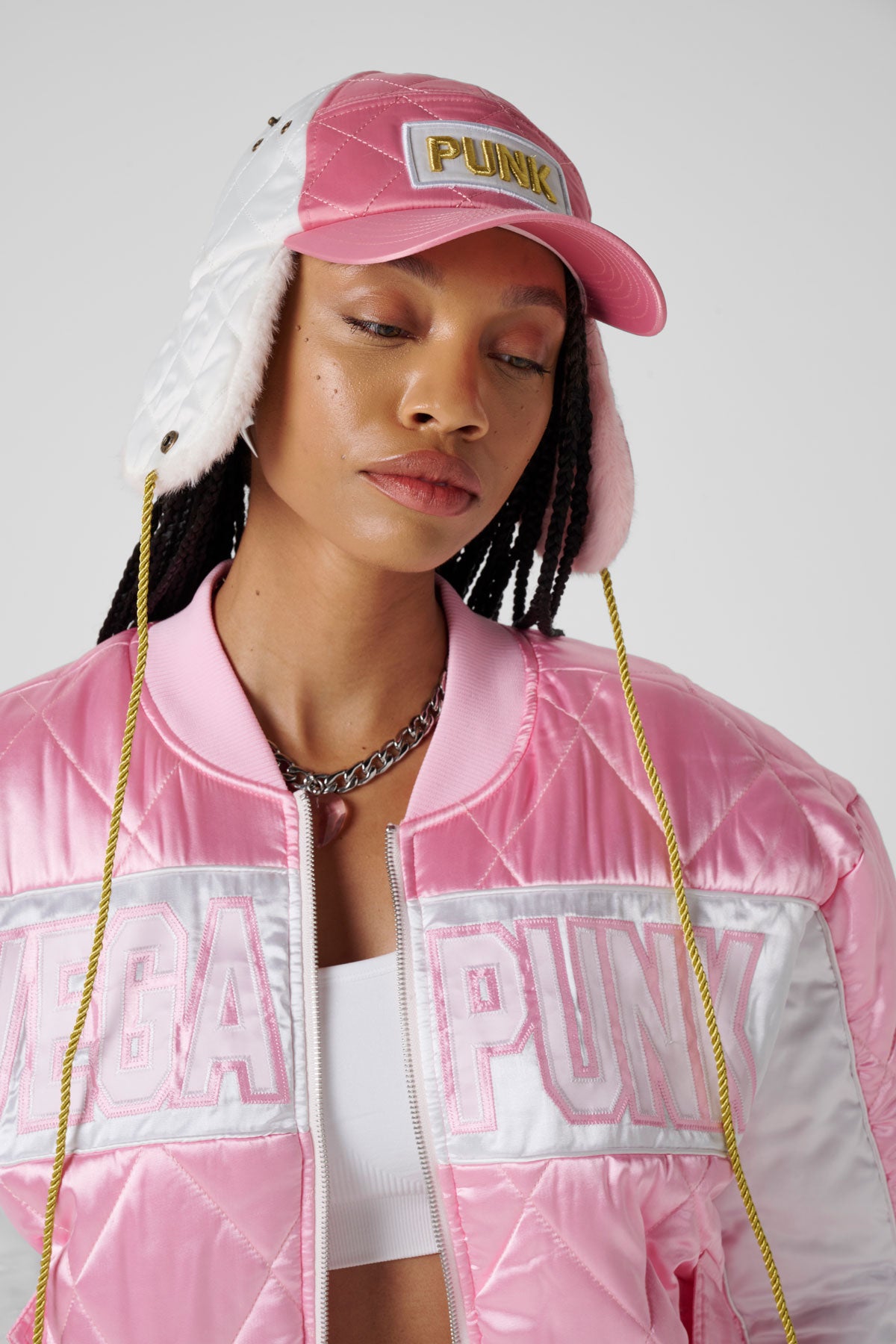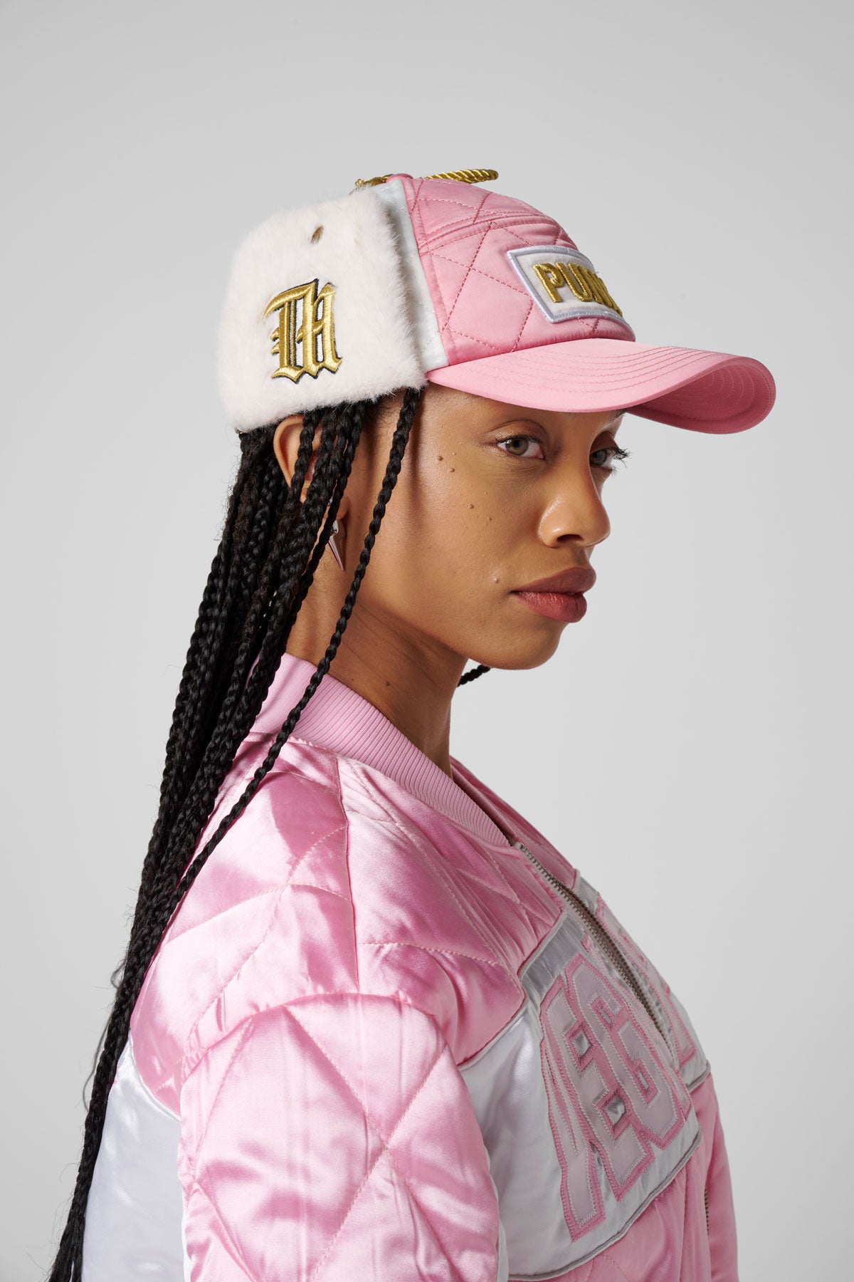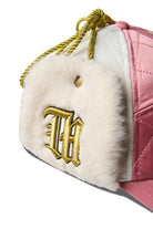 This trapper hat is made with satin polyester and features quilted design for added warmth. It also includes a durable poly rope for a secure fit.