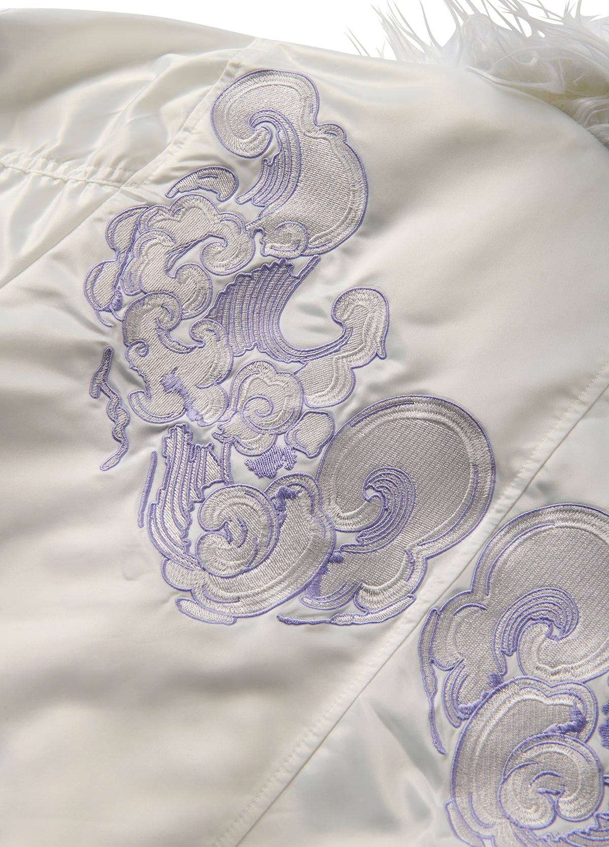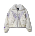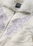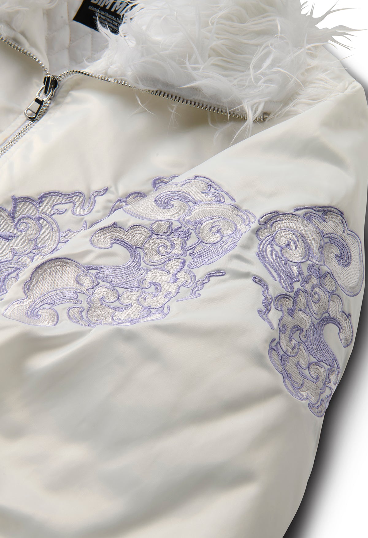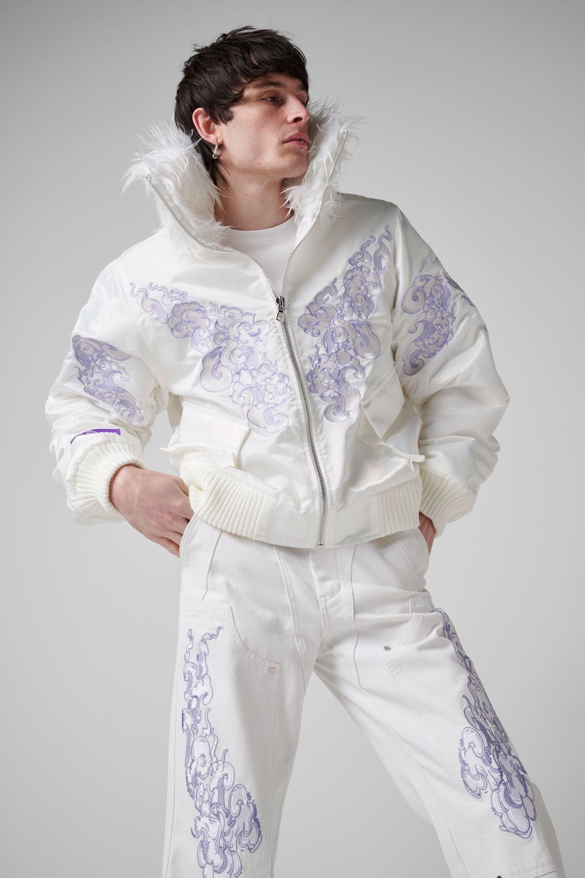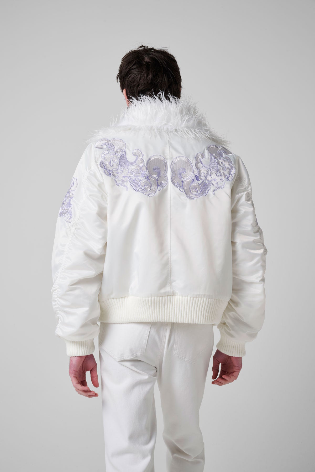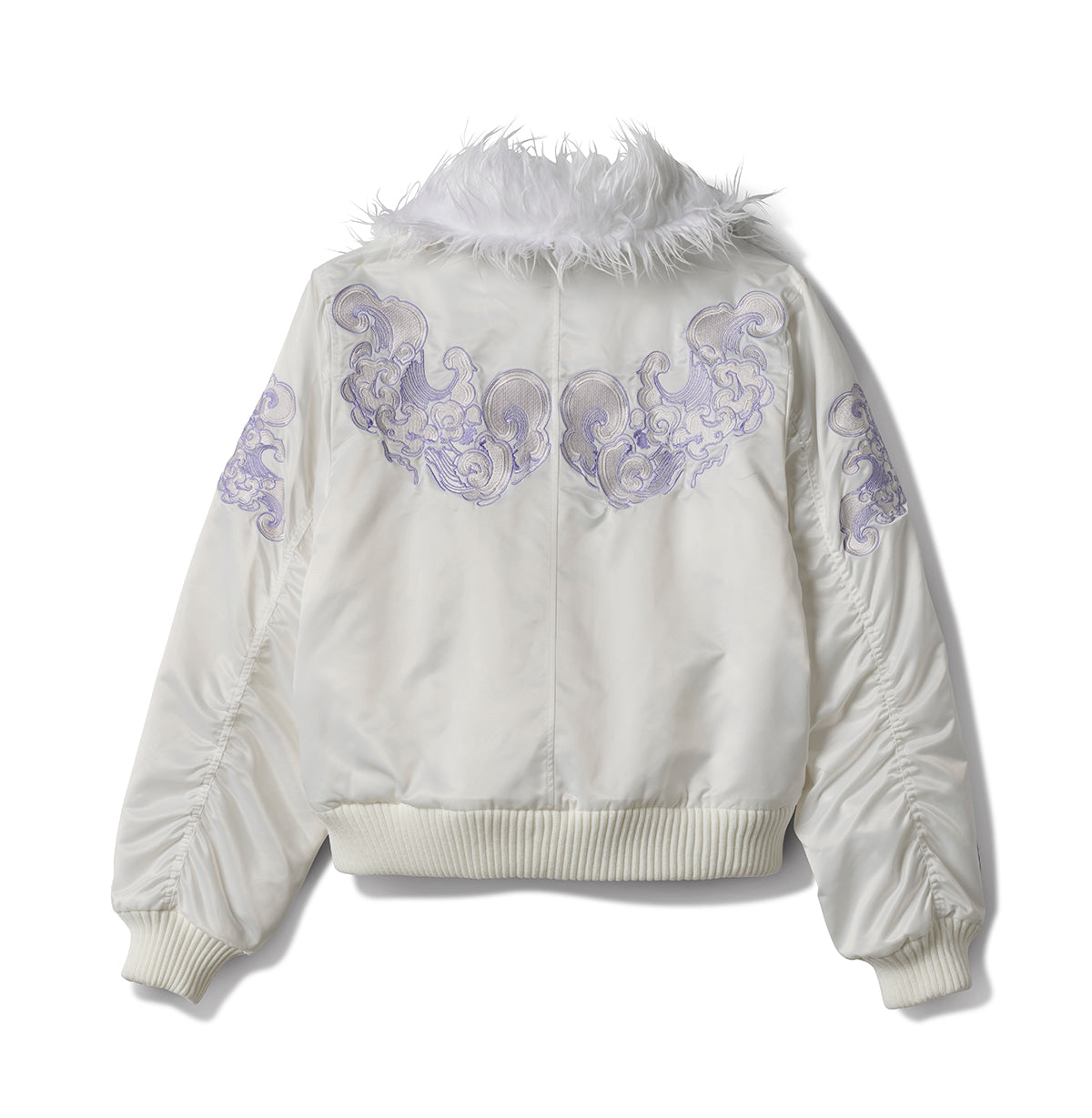 Well crafted bomber featuring a high-quality faux Mongolian sheep fur, this jacket features a diamond quilted lining for added warmth and durability. Adorned with detailed embroidery of the iconic Gear 5 cloud design on the chest, back, and sleeves, this jacket showcases expert craftsmanship. Completed with a sleek silver zipper, it is the perfect addition to any stylish wardrobe.