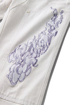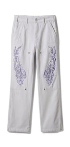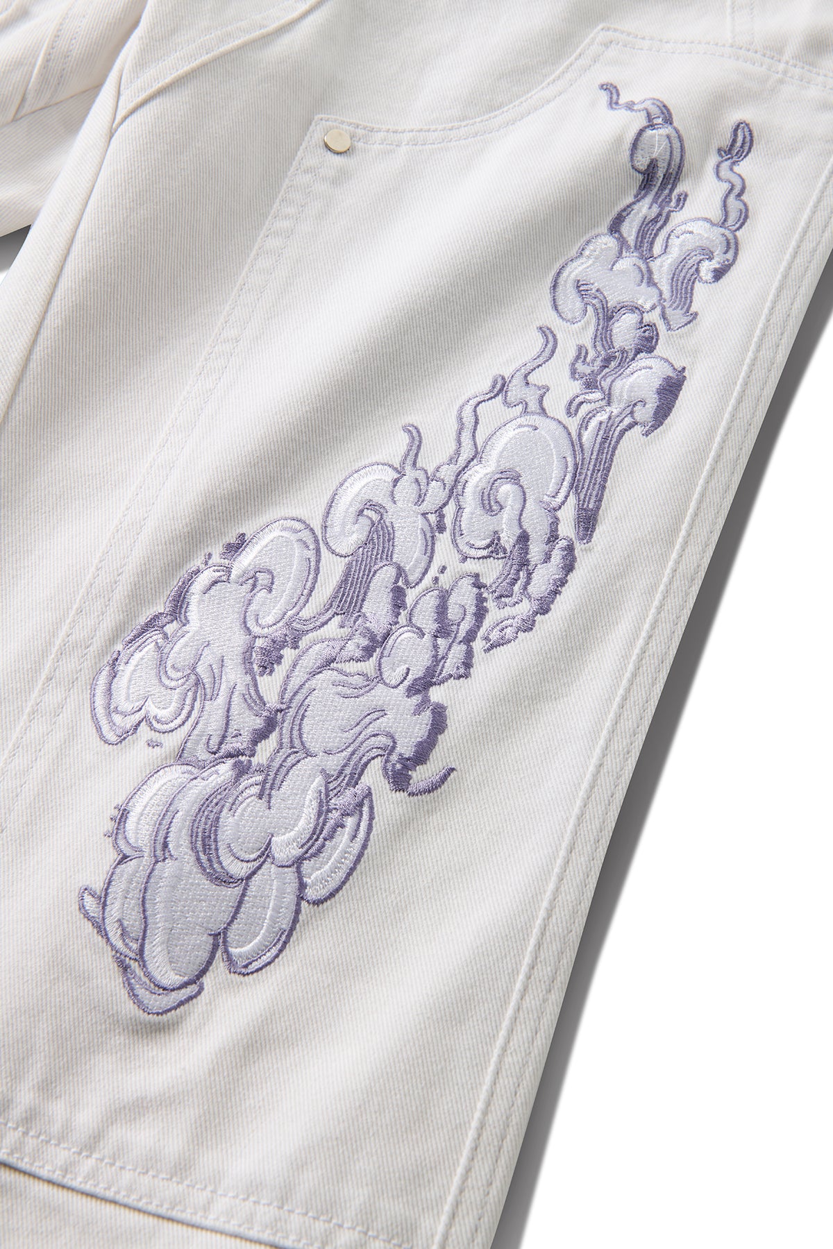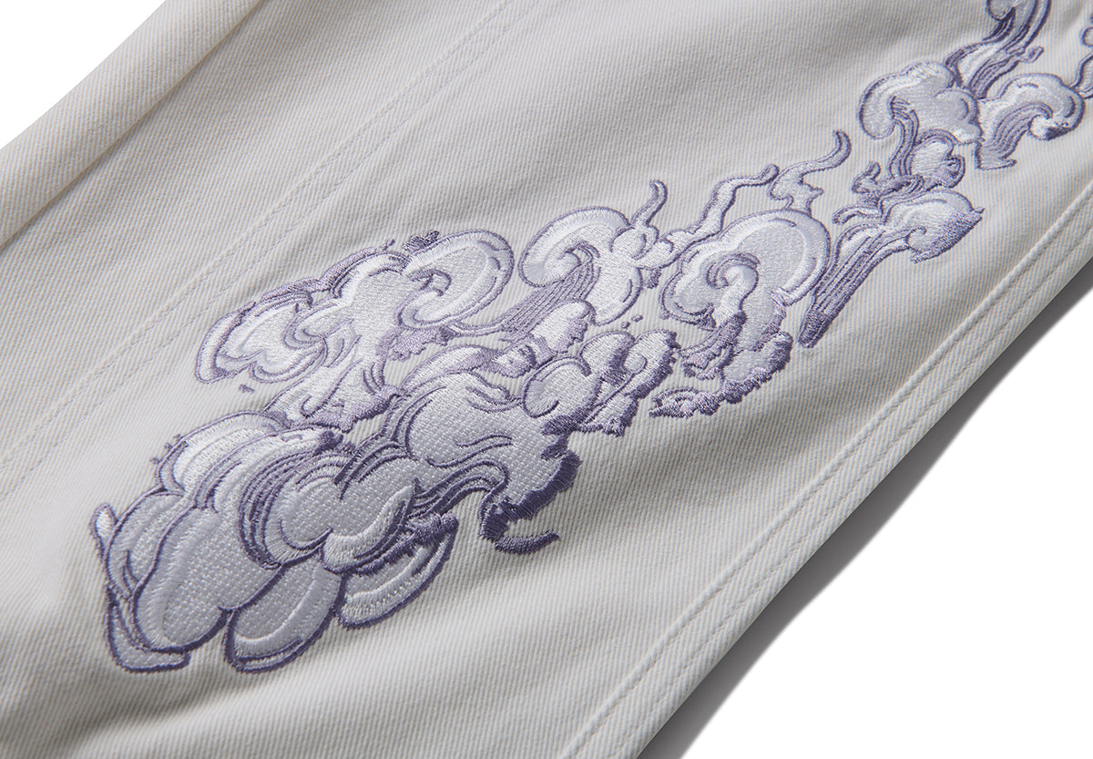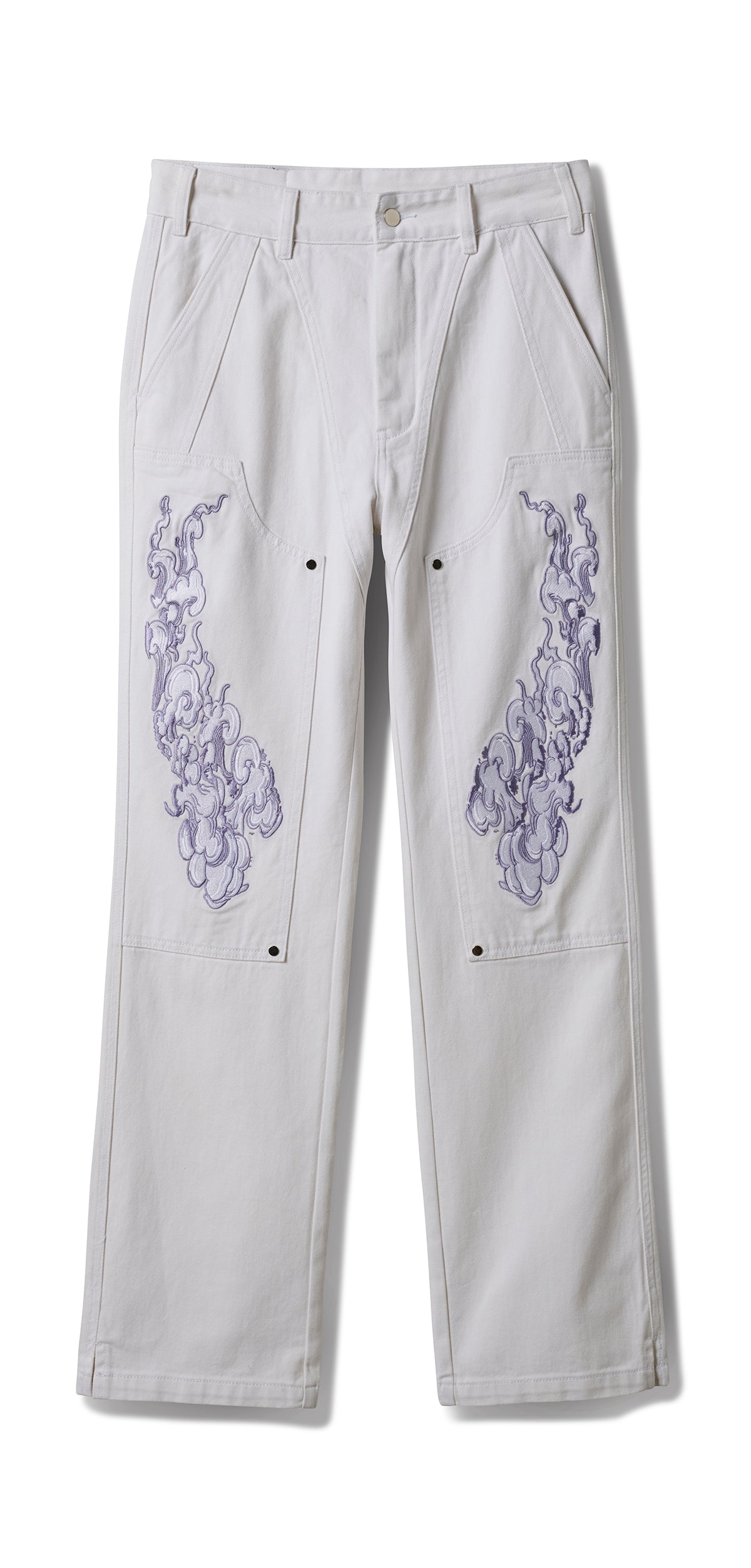 This pair of carpenter jeans is made with 100% cotton denim and features a double knee patch. The intricate embroidery of Luffy Gear 5 adds a stylish touch, while the silver rivets and side slit leg opening enhance the overall design.