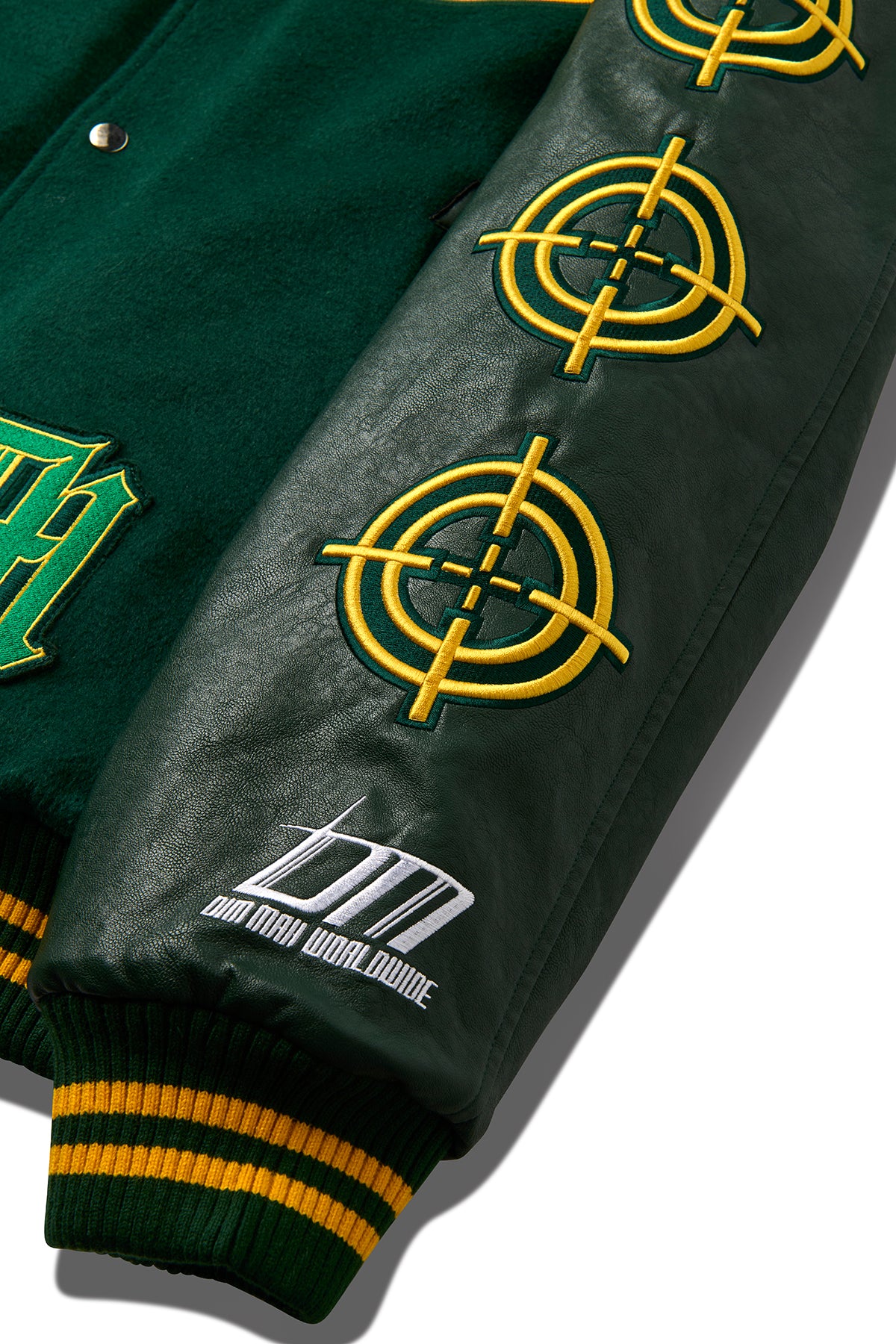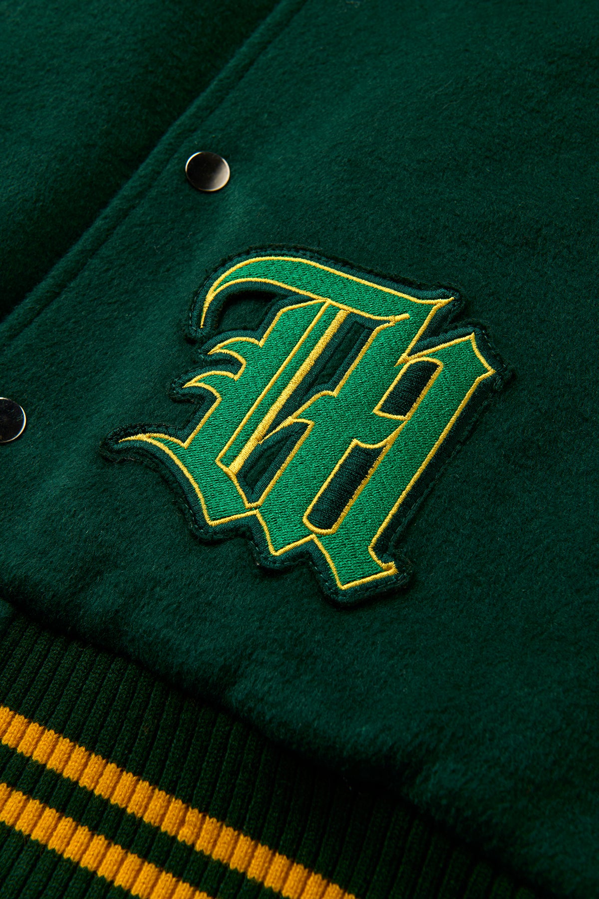 This varsity jacket features a combination of 50% wool and 50% polyester, with PU leather sleeves and a diamond quilted lining. PU leather detailing on the pockets, as well as chest and back tackle twill applique, add a touch of style. The sleeves also include a custom patch and Usopp's signature embroidered logo, and are fastened with metal snaps.